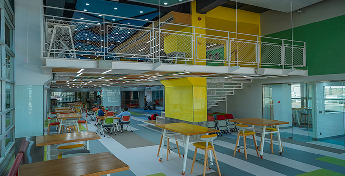 • Efficiency features include reflective roofing and façades, natural ventilation, energy-efficient lighting (86 lm/W), smart metering, and low-flow water fixtures throughout the campus.