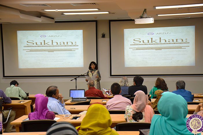 The Arzu Center for Regional Languages and Humanities held an energetic event on Tuesday, April 12th 2016 titled “Sukhan: Recitation, Oration from poetry and prose”, in collaboration with Zau, the bilingual literary magazine generated by the students of Karachi University. Held in the Soorty Lecture Theatre at Habib University, Sukhan was titled Chapter 5, aimed at the revival of the culture of literary oration. The Chief Guest at the event was Satyapal Anand, a prominent name in the field of education and the record holder for most published Urdu nazams. He was joined by celebrated poet Fatima Hasan, and Habib University’s own Afzaal Ahmed Syed, faculty member at the School of Arts, Humanities and Social Sciences.