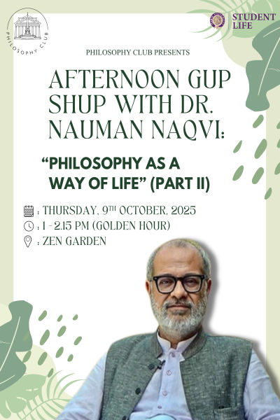 Afternoon Gup Shup With Dr. Nauman Naqvi (Part II): “Philosophy as a Way of Life” Date: October 9 @ 13:00 1:00 pm — 2:00 pmth Time: October 9 @ 13:00 1:00 pm — 2:00 pm Location: Zen Garden Organised By: Student Life Audience: All Students Description: Afternoon Gup Shup With Dr. Nauman Naqvi (Part II): “Philosophy as a Way of Life” Post navigation PreviousNext