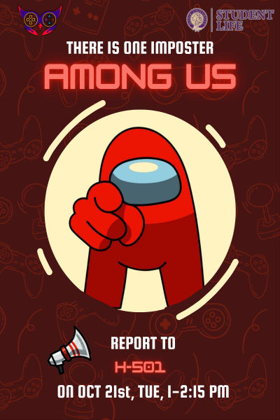 Among US Date: October 21 @ 13:00 1:00 pm — 1:01 pmth Time: October 21 @ 13:00 1:00 pm — 1:01 pm Location: H-501 Organised By: Student Life Audience: All Students Description: Among US Post navigation PreviousNext