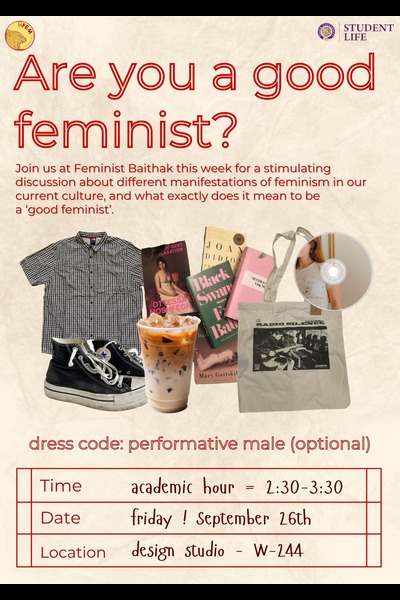 Feminist Baithak – HFEM Date: September 26 @ 13:00 1:00 pm — 2:15 pmth Time: September 26 @ 13:00 1:00 pm — 2:15 pm Location: Design Studio W-244 Organised By: Student Club/Society Audience: All Students Description: Are you a good feminist? Post navigation PreviousNext