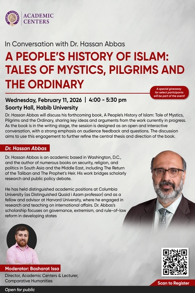 The Academic Centers at Habib University are hosting an upcoming public book talk by Dr. Hassan Abbas, a distinguished scholar of Islam, politics, and South Asian history. The session will center on insights from his recent work, examining key historical, theological, and socio-political themes and their relevance to contemporary debates.