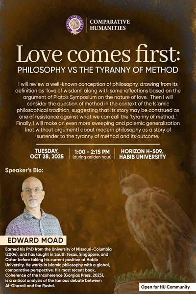 Love comes first: Philosophy vs the tyranny of method Date: October 28 @ 13:00 1:00 pm — 2:15 pmth Time: October 28 @ 13:00 1:00 pm — 2:15 pm Location: H-509 Organised By: Comparative Humanities Program Audience: All HU Community Description: Post navigation PreviousNext