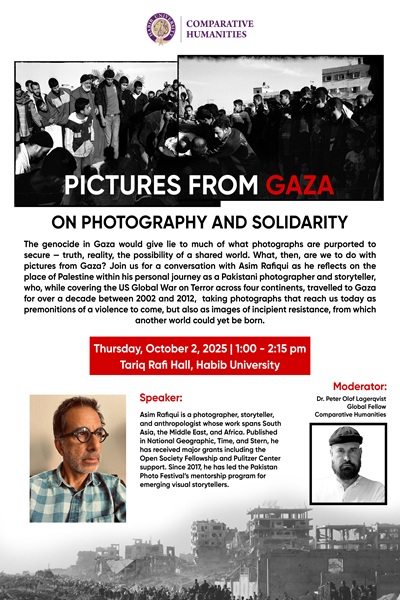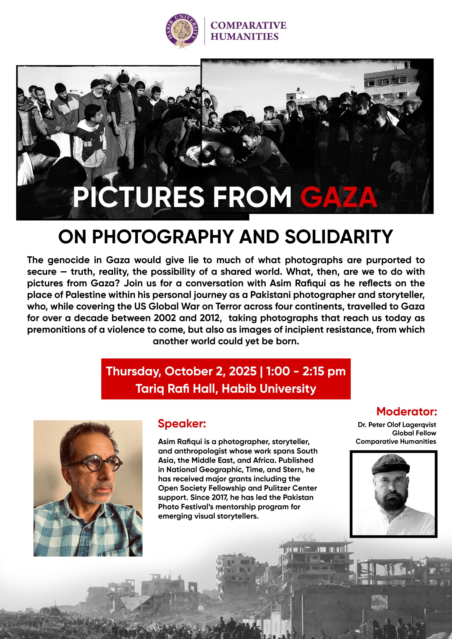 Pictures from Gaza: On Photography and Palestine Solidarity Date: October 2 @ 13:00 1:00 pm — 2:15 pmth Time: October 2 @ 13:00 1:00 pm — 2:15 pm Location: Tariq Rafi Lecture Theater (E-220) Organised By: Comparative Humanities Program Audience: All HU Community Description: Post navigation PreviousNext