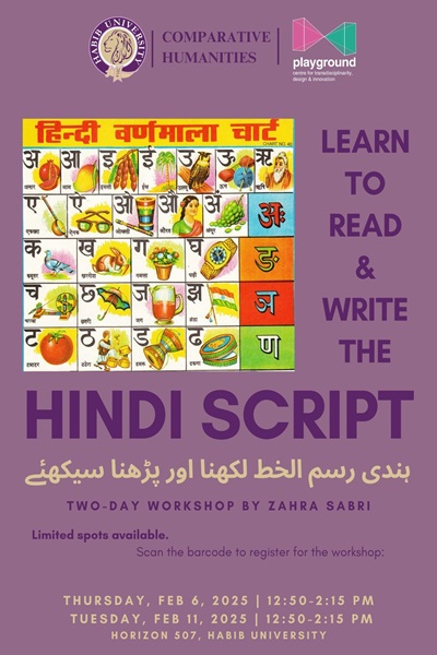 Workshop: Learn to Read and Write the Hindi Script Date: February 6 @ 12:50 12:50 pm — 2:15 pmth Time: February 6 @ 12:50 12:50 pm — 2:15 pm Location: H-507 Organised By: Comparative Humanities Program Audience: All HU Community Description: Post navigation PreviousNext